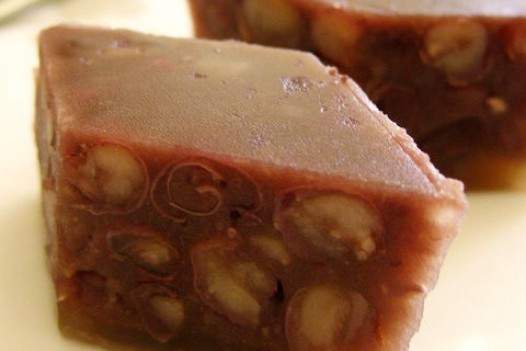 Nó đã tạo ra hai hình dạng, một với khuôn hình trái tim. Khác là chỉ cần đổ nó vào hộp ăn trưa, làm mát nó và loại bỏ nó, và cắt nó thành hình dạng kim cương. Nó có vị một chút, nhưng nhiều hơn là vị ngọt của đậu đỏ.