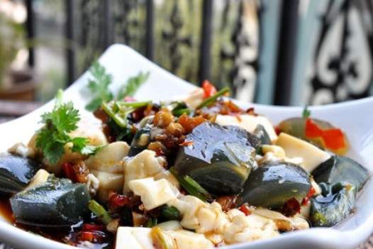 2.2 Đặt một cái đun sôi vào nồi, thêm một ít muối và khuấy đều, ngâm đậu phụ mềm trong nước muối nóng để sử dụng sau này; Hủy bỏ vỏ và rửa trứng vỏ và sử dụng sợi bông để chia thành các mảnh nhỏ để sử dụng sau