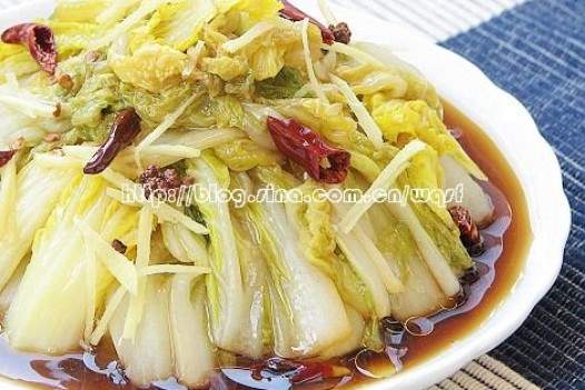 2. Đặt giấm, nước tương nhẹ, muối, đường trắng và tinh chất gà vào một cái bát nhỏ để trộn nó vào nước sốt, trộn đều với các dải bắp cải vào một hộp lớn hơn một chút, đặt các dải bắp cải được bọc trong nước sốt lên đĩa, rắc gừng trên bề mặt