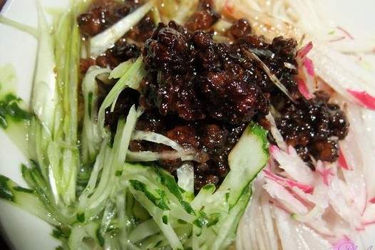 dưa chuột, nước cải củ cải Một lượng nhỏ dầu, thêm hành lá xắt nhỏ khi nó nóng, xào nó, và sau đó thêm thịt làm, và thịt sẽ có màu trắng chiên