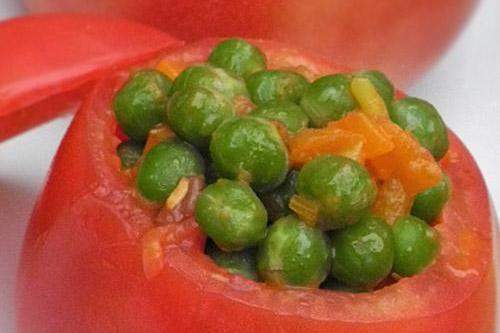 10. Sử dụng một cái muỗng nhỏ để đặt đậu xanh chiên và cà rốt thái hạt lựu vào cà chua.