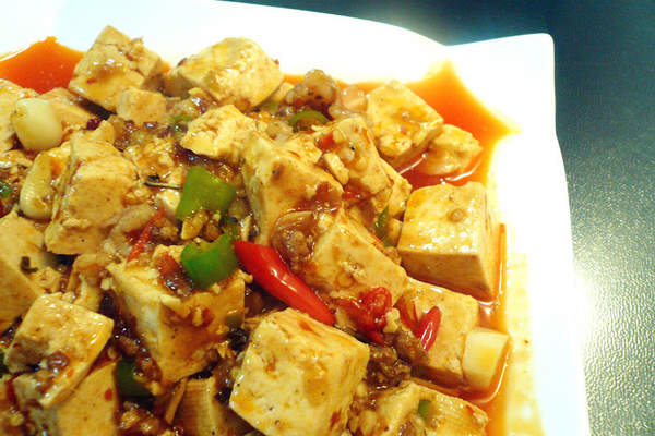 đậu phụ, thịt, nước sốt nóng, ớt xanh và đỏ