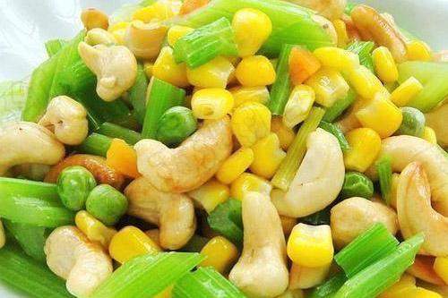 1. Chọn và rửa cần tây và cắt nó thành những mảnh nhỏ. Đặt các hạt ngô và các phần cần tây vào nước sôi và làm mờ chúng. Sau khi chùn bước cần tây, làm mát chúng ngay lập tức. nó Đổ một lượng dầu thích hợp vào chảo, thêm hạt điều và xào từ từ trên nhiệt độ thấp.